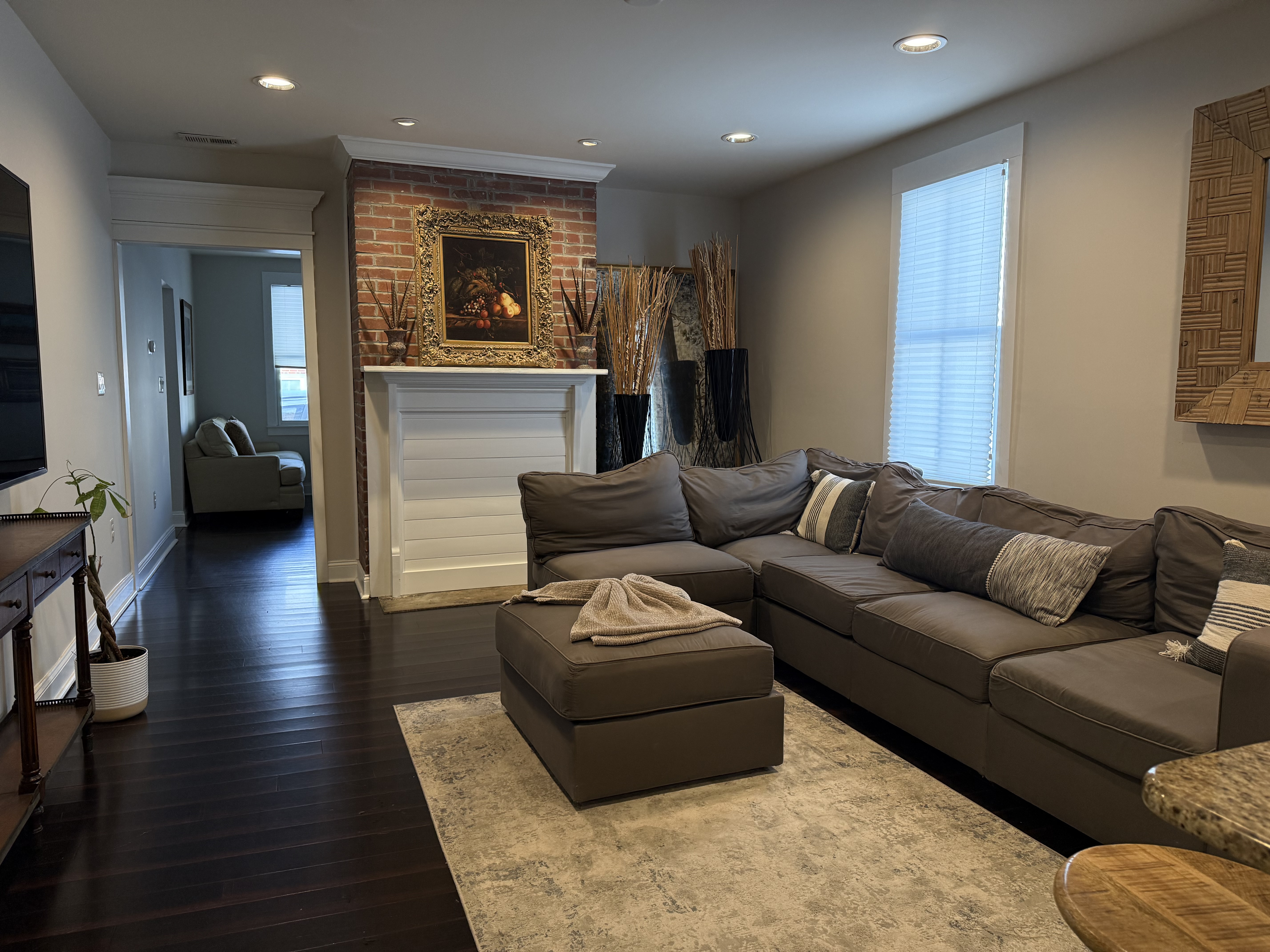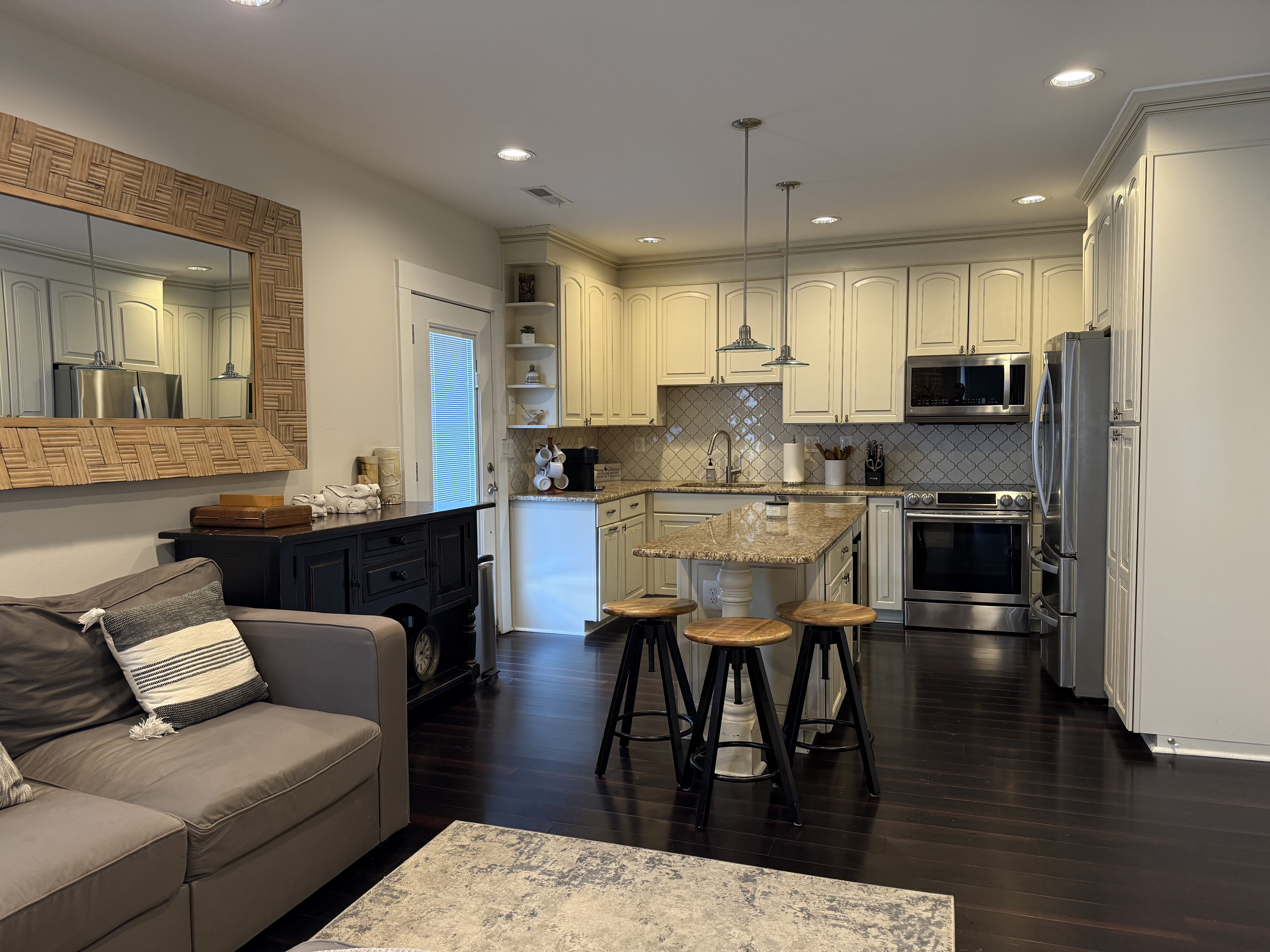 This charming home spans two levels, offering a cozy and welcoming atmosphere. On the main level, you'll find a spacious family room with a comfy couch and an extra chair, a 55" Sony flat-screen TV, 3 stools at the island in the kitchen, a fully equipped kitchen, and an adjoining laundry room (Tide pods are included). There is an additional family room at the front of the home which is great for socializing or reading while being away from the television. The first full bathroom is conveniently located at the base of the stairs. Upstairs, there are three beautifully appointed bedrooms. The primary bedroom features a queen-size bed, an en-suite bathroom, and a huge closet space. The second bedroom also has a queen-size bed and a closet. The third bedroom is furnished with a twin bed and includes a closet. Guests in the second and third bedrooms typically use the hall bathroom just outside these two rooms The private backyard is a delightful retreat, featuring a Breeo smokeless fire pit and six Adirondack chairs. I provide seasoned firewood and a starter in the silver milk can, with a long lighter available in the kitchen drawer for your use.